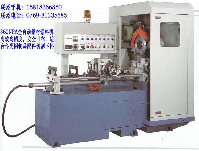 360NFA全自动铝材切割机,适合小件铝材,切割量大,精度有要求的切割工作,小件铝材可成束切割,一次可切断多支,效率极高,机器具有送料、夹钳、定位等功能,由PLC控制实现自动化切割工作,采用钨钢圆锯片切割,锯片转速每分钟3200转,切割材料断面光洁无毛刺。适合各类铝产品制造切割精度要求.如散热片铝材,U盘MP3铝件外壳,铝管,铝棒,铝合金类材料切割锯料.