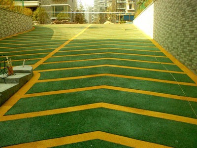常熟张家港无震动防滑车道 性能特点:? 表面粗糙度均匀,车辆行驶时无明显震动;? 表面摩擦系数大,车辆行驶也很安全;? 坡道构造的深度大,不易积水、结冰;? 坡道线条具有导向性,显目、安全;? 抗压强度高,表面硬度好、耐磨性好;? 良好的耐候性,色彩美观,使用寿命长;? 施工周期短,保养时间短,易于维护。