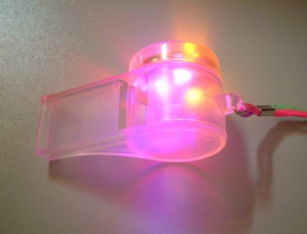 由口哨式塑料外壳组成。内有一个带3颗(也有5颗)LED灯的闪光板,按一下,可发出五颜六色的光来,再按一下,灯光就灭。吹一下还可发出悦耳的声音。特别适合于舞厅、酒吧、歌厅、演唱会、教练场,能增添欢乐气氛。 本公司秉着"追求完美、精益求精"的经营理念,以专业化的生产经验,系列化的发光产品,极具竞争力的销售价格,优质的售后服务,回报各界朋友及海内外客商。