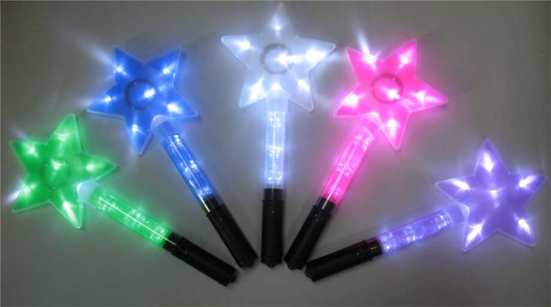 五星闪光棒总长33CM 手柄长21CM 用3颗电池供电发出闪烁的光。电量耗完更换电池又可继续工作。它有三个功能即按一下手柄上的开关灯光熄灭,按一下开关灯光上下闪动,再按一下开关灯光长亮,用9个LED灯发出五彩缤纷的光,像跳动的火焰。此产品广泛用于圣诞节、情人节、狂欢节、演唱会、DISCO舞厅、体育比赛等场所来增添现场气氛。由于其特别的功能、美观大方的造型、低廉的价格,因而具有广泛的消费市场,深受客商的欢迎。