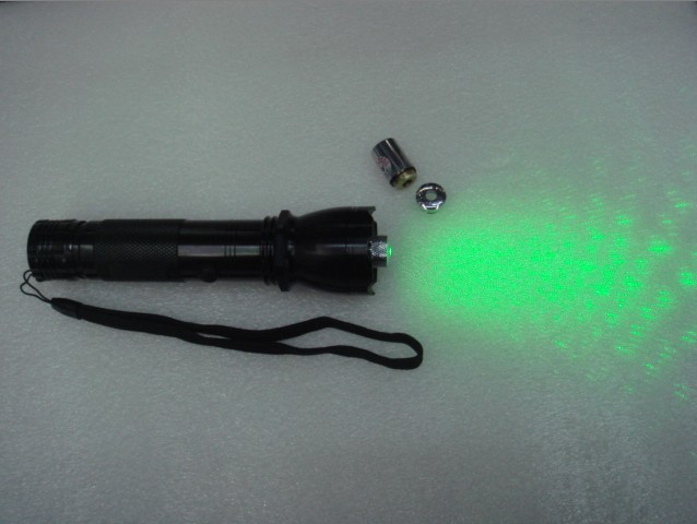 航空硬质铝, 轻触式开关,装三节七号电池,LED灯\镭笛绿光笔\满面天星图案三种功能。绿光激光手电采用大功率红外激光管泵浦激光晶体而产生,同时带有6颗高亮LED灯, 出口功率从50mW到200mW,高亮度LED工作指示,防电池反接装置,可根据用户具体用途定制。产品广泛应用于各种军用器械及仪器装备、野外探险指示、激光指向、教学试验光源、演示用激光光源等。