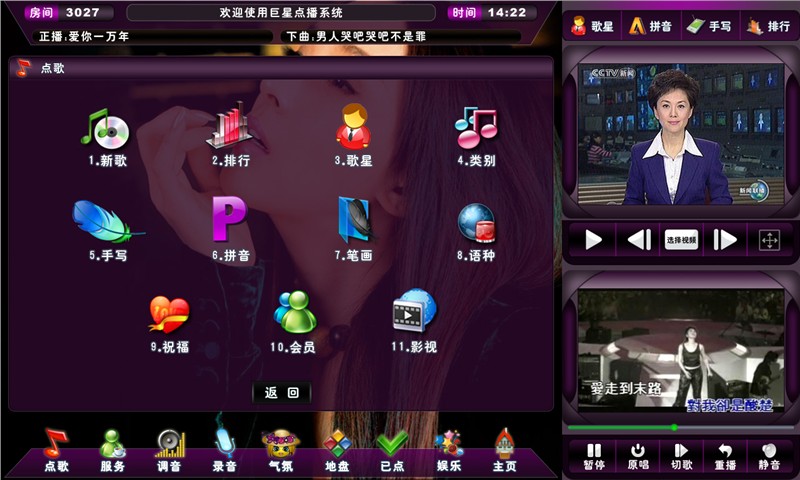 通过后台管理系统,前台可以给各包房发短消息、广告、祝词、寻人启示等,也可以向各包房发送歌曲,配合广告祝福字幕;“K歌友“可以通过“手写祝福界面”在自己的包房发短消息,祝福语;客人在生日、新婚之际收到KTV的贴心祝福,惊喜之余更会对KTV的服务增添好感,成为您的老客户也就不足为怪了。
