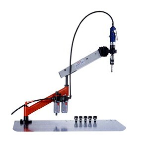 气动攻丝机新型专利产品,压缩空气驱动,安全快速高效、较小气压力和气量(6-8Kg/cm2),超大扭力输出、能对各种钢材、铁、铜、铝、塑料等材料攻丝、筒夹带过载保护装置,丝锥损伤较少,螺牙精度高、操作简单轻便,完全不需要经验和力量、加工成本较使用CNC加工中心,铣床带攻丝器或手动攻丝低许多、较重的工作物不需要定位装置或移动,工作面积特大(半径900-2000mm范围内)、定位迅速快和较高的切削速度,提高生产效率,快速收回机器成本,通孔或盲孔,丝攻均不致断裂、垂直、水平(万向)角度均能攻丝。加工加工范围(M3-M24) 产品规格有:M3-12系列,M5-16系列,M6-24系列