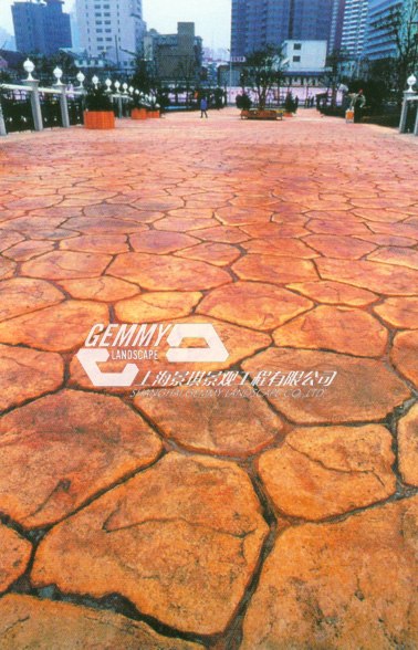 2. 用硬化剂材料制作的彩色压模地坪具有抗耐磨、防滑、抗冻、不易起尘、易清洁、高强度、耐冲击、且色彩和款式方面有广泛的选择性、灵活性、成本低和优质环保等特点,是目前园林、市政、停车场、公园小道、商业街区和文化娱乐设施领域的理想选择。