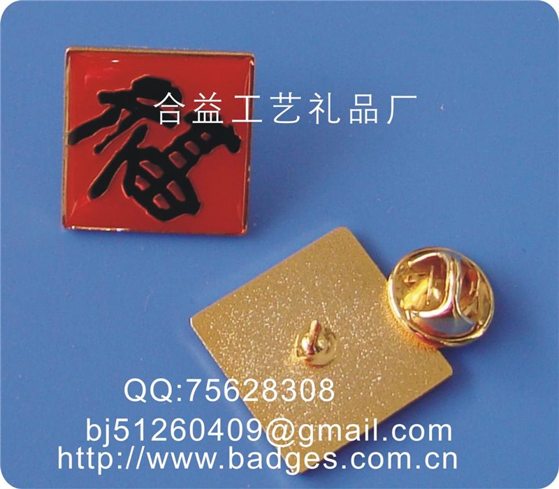 徽章.此产品材质一般为青铜、铁、锌合金、铝片等,工艺有蚀刻、冲压,合金压铸等,表面上色效果有烤漆、软珐琅等。电镀效果有镀金、镀镍、镀雅镍、镀黑镍、镀雾金等。配件一般用安全别针或蝴蝶帽,也可选择高级卡帽和橡胶帽。普通胶袋单个包装、适量装箱