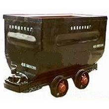 固定式矿车 车箱与车架固定联接,须用翻车机将矿车翻转卸载。其基本组成为车箱、车架、缓冲器、联接器和行走机构。车架为一金属结构,能承受牵引力、制动力、矿车之间的碰撞力和钢轨冲击力缓冲器装在车架两端,用以缓和两车之间的冲击力。联接器是联接机车和矿车的部件,常用的有插销链环和回转链,大型矿车采用兼具缓冲器作用的自动车钩。行走机构是由4个车轮和2根轴组成的两个轮对。矿车和物料的总和超过20吨时,一般应增加轮对数目。对多于两个轮对的矿车,为便于通过弯道将两个轮对组成一个有转盘的小车,这种小车称为转向架。