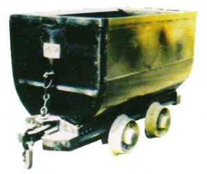 固定式矿车 车箱与车架固定联接,须用翻车机将矿车翻转卸载。其基本组成为车箱、车架、缓冲器、联接器和行走机构。车架为一金属结构,能承受牵引力、制动力、矿车之间的碰撞力和钢轨冲击力缓冲器装在车架两端,用以缓和两车之间的冲击力。联接器是联接机车和矿车的部件,常用的有插销链环和回转链,大型矿车采用兼具缓冲器作用的自动车钩。行走机构是由4个车轮和2根轴组成的两个轮对。矿车和物料的总和超过20吨时,一般应增加轮对数目。对多于两个轮对的矿车,为便于通过弯道将两个轮对组成一个有转盘的小车,这种小车称为转向架。
