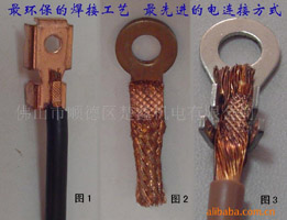 该产品是通过超声波焊接机把电线、电缆、铜绞线、铜编织线(铜辫线)与端子焊接在一起。该工艺适用于汽车行业和电子行业,可以把不同尺寸的导线焊到接线端子上,使汽车电线和电子行业中的电线的焊接达到最好的效果。优点:焊接时间短,不需任何助焊剂、气体、焊料,牢固度高,无钎焊的加温发热缺陷,符合ROHS指令及安规