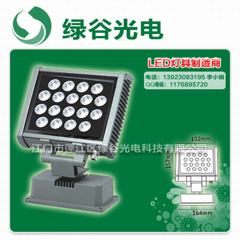绿谷光电LED投光灯(LED大功率投光灯)照射距离达5-30米,特别适合景观建筑物楼体,户外广场,景观物以及墙面、陈列品刷色。防护等级达IP65,能适应是内外各种温湿度环境。颜色有红色/黄色/蓝色/绿色/白色/七彩变色等效果。通过丰富多彩的光与水的有机结合,产生灵动的感觉,带给您梦幻般的意境。绿谷光电LED投光灯采用进口芯片,亮度高,低能耗,低热量,寿命长达到 100,000H,可分为单色,变色两种,高压铸铝成型外壳,4mm钢化安全玻璃。