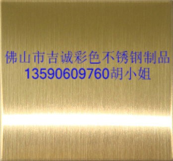 不锈钢拉丝板是指在不锈钢镜面板的基础上结合拉丝制作成的产品,其观赏效果更佳,更耐看! 镜面板采用研磨液通过抛光设备在不锈钢板面上进行抛光,使板面光度像镜子一样清晰、透亮。其特点是耐磨、耐压、耐腐蚀;耐蚀性已达到国际先进水平(国际水平是500g正压力软橡皮磨擦200次不退色,本公司产品能达到5000次不褪色),且色泽艳丽,而价格只是进口产品的十分之一。当今国民经济迅速发展,已得到广泛运用:高档酒店、宾馆、KTV、其它娱乐场所建筑装璜,电梯装璜、工业装璜、高档家居装璜等领域;可供广大客户选择的颜色有:钛黑(黑钛)、钛金、钛白、天蓝、宝石蓝、咖啡色、茶色、翠绿、绿色、紫色、古铜、青古铜、香槟金、玫瑰金、佛山市吉诚不锈钢有限公司是佛山的一家大型钢材供应商,是华南地区大型钢材加工、销售及配送中心之一。 专业制作彩色不锈钢板,颜色有纯黑、宝石蓝、玫瑰金、古铜、咖啡、幼彩、锆金、茶色、香槟色等,各种材质不锈钢管,不锈钢平板,BA板、8K镜面板、雪花砂板、拉丝板、防滑板、钛金板、磨砂板、喷砂板、蚀刻花板、压纹板、压花板、各类孔板、酒店用品、宾馆用品、广告灯箱、各类标示牌、天花板、电梯厢板、车箱板等