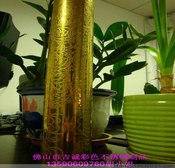 蚀刻工艺是在物体表面通过化学的方法,腐蚀出各种花纹图案。以8K镜面板为底板,进行蚀刻处理后,对物体表面再进行深加工,可进行局部的和纹,拉丝,嵌金,局部钛金等各式复杂工艺处理,实现图案明暗相间,色彩绚丽的效果。蚀刻不锈钢包括彩色不锈钢蚀刻板,图案多种,可供广大选用的颜色有:钛黑(黑钛)、天蓝、钛金、宝石蓝、咖啡色、茶色、紫色、古铜、青古铜、香槟金、玫瑰金、紫红、钛白、翠绿、绿色等,适用于:星级酒店,KTV,大型商场,高级娱乐场所等。彩色不锈钢板加工,不锈钢制品加工,不锈钢工程加工,经过剪折、数控V槽刨坑、数控激光加工,把彩色不锈钢板加工成门套,浴室柜门,踢脚线及不锈钢彩色板的各种成品.我公司设备配套齐全,加工范围广,加工精度高,适合多种要求的试制和批量化的产品加工。