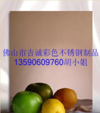 可供广大客户选择的颜色有:钛黑(黑钛)、钛金、钛白、天蓝、宝石蓝、咖啡色、茶色、翠绿、绿色、紫色、古铜、青古铜、香槟金、玫瑰金、佛山市吉诚不锈钢有限公司是佛山的一家大型钢材供应商,是华南地区大型钢材加工、销售及配送中心之一。 专业制作彩色不锈钢板,颜色有纯黑、宝石蓝、玫瑰金、古铜、咖啡、幼彩、锆金、茶色、香槟色等,各种材质不锈钢管,不锈钢平板,BA板、8K镜面板、雪花砂板、拉丝板、防滑板、钛金板、磨砂板、喷砂板、蚀刻花板、压纹板、压花板、各类孔板、酒店用品、宾馆用品、广告灯箱各类标示牌、天花板、电梯厢板、车箱板等。吉诚不锈钢主要生产钛金系列产品、 彩色不锈钢、艺术不锈钢产品的企业。产品有彩色不锈钢、不锈钢钛金板、不锈钢镜面板、不锈钢喷砂板、不锈钢蚀刻板、不锈钢压花板等。产品销往大陆、美国、加拿大、英国、爱尔兰、日本、韩国等世界各地。欢迎广大新老客户选购,来电垂询。