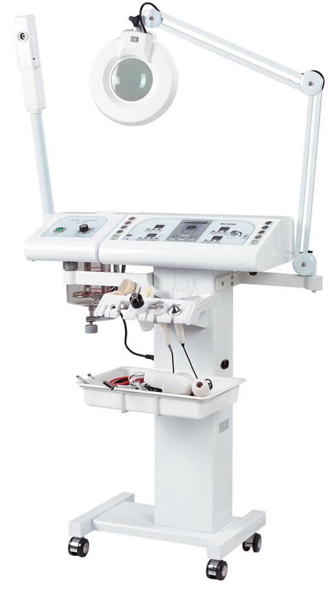 十一合一多功能综合机具有超声波、高周波电疗、吸黑头、喷化妆水、瞬间扫斑、磨皮,导出,导入,冷光放大镜,热喷,紫外线皮检灯等功能,每个功能都具有独立开关,方便使用,解除了传统多功能机一损俱损的缺点。本机外形设计大方、美观、新颖,面板色彩柔和,操作快捷方便,充分体现本机实用价值。