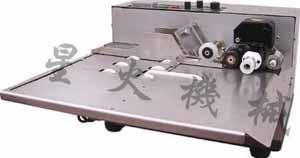 固体墨轮印字机是一种先进的接触式热打码机。本机采用间歇式自动加热和精密的机械相结合,可根据用户需要,任意选择印字内容与位置,并可设定压印张数,打印速度快,性能可靠,字迹清晰,压印动作及计数采用光电开关控制。