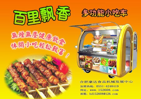 多功能小吃车车面由不锈钢板制造,易清洗,更环保;肉油.炭火分离, 无油烟,无飞灰,更健康;内部结构采用二次进风原理设计,炭火燃烧更旺,更高效;车体采用双层钢板保温设计,保温效果显著,更节能; 燃料采用机制木炭,肉味更香美;车体移动,固定均可.运转自如;更便捷;写真画面,美观大方价格不高,投资无风险;统一品牌,强位广告支持;易学易会,长久无偿提供美食配方