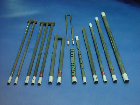 硅碳棒电热元件是选用优质绿色碳化硅为主要原料,经加工制坯、高温硅化、再结晶而成的棒管状非金属高温电热元件。该元件与金属电热元件相比,具有使用温度高(可达1500℃)、抗氧化、耐腐蚀、寿命长、变形微、安装维修方便等特点。硅碳棒产品有粗端部、等直径硅碳棒,类型有直型棒、U型棒、三相棒、枪型棒、五节型棒、槽型棒、单螺纹棒、双螺纹棒等各种规格型号,硅碳棒的直径范围为Φ8-Φ54mm。