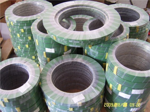 金属缠绕垫片采用优质SUS304、SUS316(“V”形或“W”形) 金属带及其它合金材料与石墨、石棉、聚四氟乙烯、无石棉等软性材料相互交替重叠螺旋缠绕而成,在开始及末端用点焊方式将金属带固定。金属缠绕垫片为半金属密合垫中回弹性最佳的垫片,金属缠绕垫片结构密度可依据不同的锁紧力要求来制作,并利用内外钢环来控制其最大压紧度,缠绕垫片接触的法兰密封面的表面精度要求不高。金属缠绕垫片特别适用于负荷不均匀、接合力易松弛,温度与压力周期性变化、有冲击或震动的场合。缠绕