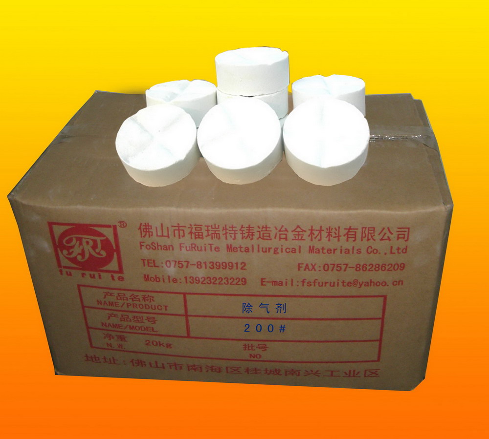 本产品为白色块状熔剂,除气剂200#为块状除气剂,具有强力除气功能,适用于反射炉、坩锅炉等各种炉型。由于不含钠,故适用于任何种类的铝合金,操作方便,简单易用,在除气系列中效率最高。