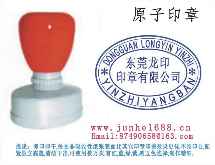 原子印特点:原子印是采用1972年美国庄臣公司发明的原材料制作而成,龙印原子印是目前商务活动中广泛应用的印章之一,属国际第二代产品,外形美观,印面清晰,无需印台、无需加油,即盖即干,携带方便,绝不褪色等特点,机器检测可以使用36000次以上。适用于:各类部门章。合同专用章、业务专用章、报关专用章及其他工作用章等。不适合银行印签印章。电子印 印迹清晰,字迹的干涸时间短,附着力强,具有较强耐水性。成品外形美观、结构合理。使用次数为2-3万次。渗透印特点:渗透印:印迹较原子印略次,自带印油,使用方便,可反复加油使用。经济耐用,携带方便。但章迹干涸时间较长,使用次数为1-2千次,并可反复注油。适用于做地址、公司名称、文件更改、邮件收发印等方面适用于:合同专用章、业务专用章、报关专用章及其他工作用章等