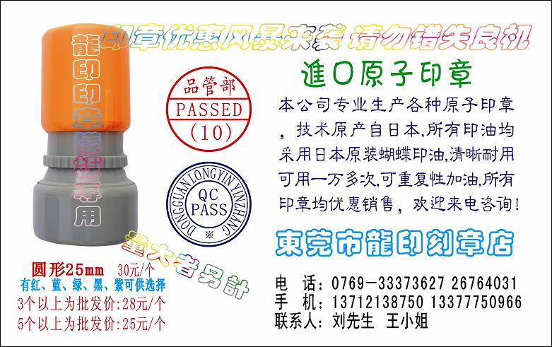 原子印特点:龙印原子印是目前商务活动中广泛应用的印章之一,属国际第二代产品,外形美观,印面清晰,无需印台、无需加油,即盖即干,携带方便,绝不褪色等特点,机器检测可以使用36000次以上。适用于:各类部门章。合同专用章、业务专用章、报关专用章及其他工作用章等。不适合银行印签印章。电子印 印迹清晰,字迹的干涸时间短,附着力强,具有较强耐水性。成品外形美观、结构合理。使用次数为2-3万次。渗透印特点:渗透印:印迹较原子印略次,自带印油,使用方便,可反复加油使用。经济耐用,携带方便。但章迹干涸时间较长,使用次数为1-2千次,并可反复注油。适用于做地址、公司名称、文件更改、邮件收发印等方面适用于:合同专用章、业务专用章、报关专用章及其他工作用章等东莞印章,东莞刻章,东莞日期印,东莞原子印