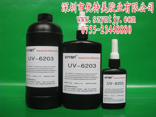 深圳市优特美胶业有限公司专业生产销售GYYMT(固优)品牌6000系列紫外线胶水、无影胶水、UV胶水、光固化胶水、太阳胶水,光敏胶水。主要用于粘接、固定表面披覆等是一款不含溶剂的环保胶粘剂,在紫外线照射下数秒钟内固化.UV-6203产品主要于玻璃茶几、玻璃展示柜、玻璃人体称、玻璃小面积粘接、玻璃家具、玻璃灯饰、玻璃工艺品、水晶奖杯、水晶金属、玻璃金属、等产品之间的粘接其粘接强度均大于玻璃(水晶)本体强度。具有耐黄变、高韧性、耐冷热冲击性能优良。