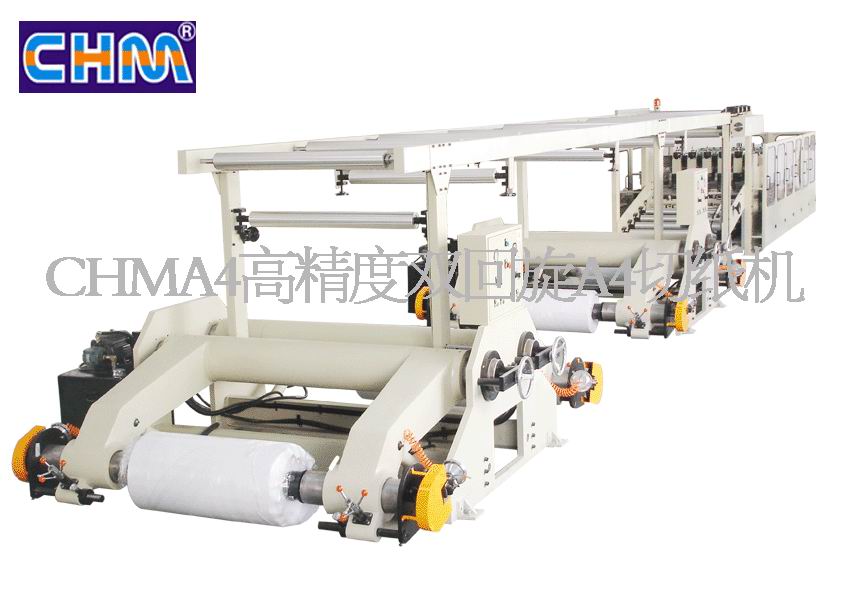 CHM - A4-4高精度双滚筒卷筒切A4纸机,它集电气自动化、PLC控制系统和机械自动化为一体的由纸卷展开、切纸、计数、输送、令纸排出的连续生产的一整套加工生产设备。