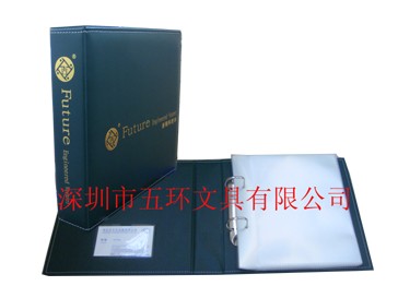 制作工艺:绿色仿皮包纸板衬海绵,四周车线,封面,脊背和背面烫金LOGO,摊开左面电压名片位,右面钉二孔D型夹,配40张PP内页
