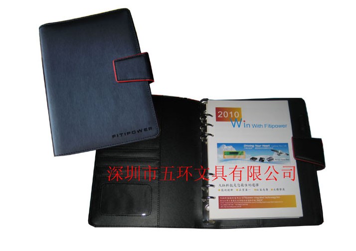 制作工艺:仿皮皮料,包边车线,封面压印LOGO,订六孔夹,内页为100张80G道林纸,配企业宣传彩页一张,翻开左边4层插袋,名片位,以入侧边袋。