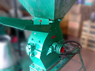工作原理:该机是切向进料锤片式粉碎机。在粉碎室中,转子高速旋转,饲料通过锤片的打击和齿板的摩擦作用而粉碎成细粒,从筛孔中漏下,然后有离心式风机吸送至储料袋或集料室。