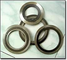 金属缠绕垫片采用优质SUS304、SUS316(“V”形或“W”形) 金属带及其它合金材料与石墨、石棉、聚四氟乙烯、无石棉等软性材料相互交替重迭螺旋缠绕而成,在开始及末端用点焊方式将金属带固定。金属缠绕垫片为半金属密合垫中回弹性最佳的垫片,金属缠绕垫片结构密度可依据不同的锁紧力要求来制作,并利用内外钢环来控制其最大压紧度,缠绕垫片接触的法兰密封面的表面精度要求不高。金属缠绕垫片特别适用于负荷不均匀、接合力易松弛,温度与压力周期性变化、有冲击或震动的场合。缠绕垫片是阀门、泵、换热器、塔、人孔、手孔等法兰连接处理想的静密封原件。