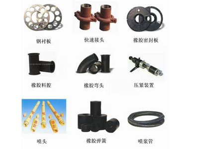 2、喷浆机配件:橡胶料腔、喷浆管、橡胶弹簧、喷头、喷头座、喷头总成、橡胶弯头、矿车轮、耐磨钢衬板、橡胶密封板、锥形套管、旋流器、压紧装置、聚氨酯耐磨衬板、齿轮、料斗、筛网、空压机、快速接头卡兰及接头座等配件