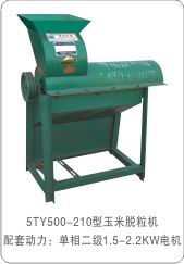 工作原理:玉米脱粒机,工作时,玉米在高速旋转的转子与滚筒内受到撞击,籽粒由筛孔分离出去,玉米芯从机器尾部排出,玉米丝,皮从风口排出。 进料口设在机器上盖上部,玉米棒通过进料口进入脱粒室,在脱粒室内受到高速旋转的转子撞击玉米粒脱落,通过筛孔分离出去,喂入口前下部有一块挡板,防止脱落的玉米粒飞溅伤人。该种机器,脱粒的效率由滚筒的长度和直径而确定,用户可根据自己的脱粒效率,合理选用此系列玉米脱粒机。转子上的钉齿是易损件,应经常检查其磨损情况,当钉齿磨损四分之一时,可用电焊修复或更换新钉齿,如修复更换新钉齿时,必须全部修复或更换,以保证转子的平衡;筛网也是易损件,如筛网破损,请更换新筛网。