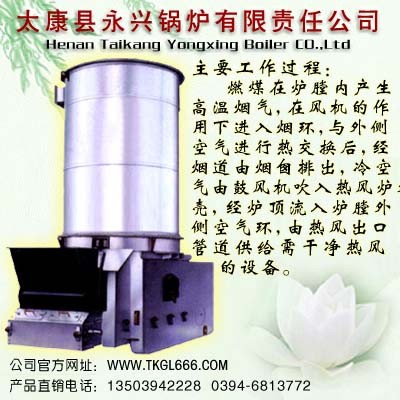 热风炉特点: 1.采用多头螺旋槽片换热技术和紊流原理,全钢板多层套管式结构,热效率高。 2.无压力运行。 3. 供热温度高,加热范围广,热风温度可因需调节。 4.以空气为介质,热风干净,无污染。 5.特别使于水资源贫缺地区使用。 本公司有多年生产历史,具有丰富的运行经验,供热范围在150-550℃。对温度高于550℃的供热装置,本公司提供高温热风炉已达到技术要求。公司和清华大学热力系华鲁技术开发公司共同研制开发高,中,低温热风炉,河南独家通过省质 监部门产品质量认定。
