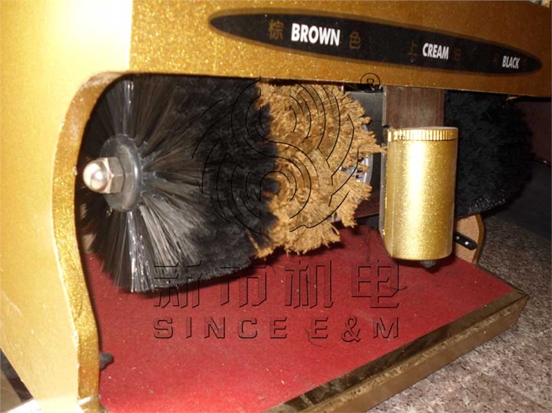 擦鞋机毛刷轮:擦鞋机毛刷轮每组有四个毛刷轮,毛刷轮材质分别由尼龙丝和棉线制成,通常在塑料芯或木芯上打孔植入刷毛。颜色有棕色和黑色两种,塑料丝和棉线各两个。竖式擦鞋机毛刷轮规格为木芯直径55mm ,内孔16mm,毛直径150mm,木芯长80mm;家庭用横式擦鞋机毛刷轮规格为木芯直径50mm,内孔12mm,毛直径145mm,木芯长95mm,每套2只。棕色毛刷轮分塑料丝毛刷轮、棉线毛刷轮,黑色毛刷轮分塑料丝毛刷轮、棉线毛刷轮。
