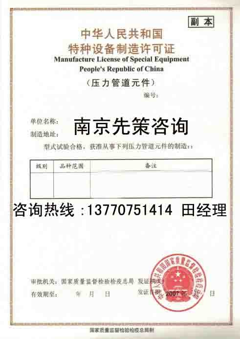 锅炉制造许可证 压力容器制造许可证 压力管道制造许可证 压力管道元件许可证 阀门制造许可证 无缝钢管制造许可证 焊接钢管制造许可证 密封件制造许可证 阀门铸件制造许可证 电梯制造许可证 乘客电梯制造许可证 货载电梯制造许可证 电梯安装改造维修许可证 起重机械制造许可证 桥式起重机制造许可证 门式起重机制造许可证&n