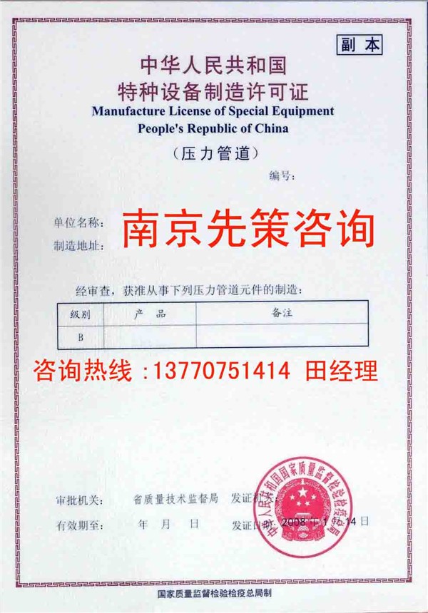 锅炉制造许可证 压力容器制造许可证 压力管道制造许可证 压力管道元件许可证 阀门制造许可证 无缝钢管制