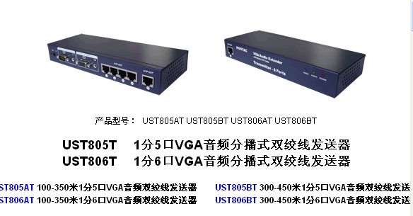 UST805T和UST806T分别为1分5口和1分6口VGA音频分播双绞线发送器,采用外接+9/12VDC电源供电。本装置具本地VGA音频输出、远程频率补偿保护等功能。与UST801T、UST802T、UST803T、UST804T、UST808TVGA音频分播式发送器组合可成为1分7_8_9_10_11_12_13_14口VGA音频分播式双绞线发送器,同时亦可与UST404VS、UST408VS 分播式VGA立体声长线驱动器配合使用。UST805AT为100-350米1分5口VGA音频双绞线发送器,UST805BT则为300-450米1分5口VGA音频双绞线发送器,UST806AT为100-350米1分6口VGA音频双绞线发送器,UST806BT则为300-450米1分6口VGA音频双绞线发送器。