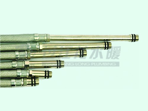 过江龙不锈钢单枪长头编织管:包括不锈钢单枪进水软管,彩条单枪进水软管,铝镁合金丝单枪进水管,内管外丝可随意组合满足不同龙头品种的需要。可来样定做。