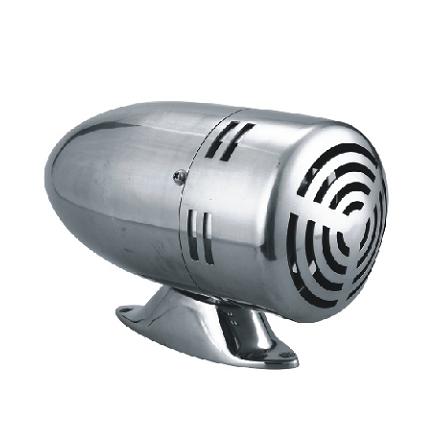 小型工业警报器是一种全方位发出高强度的与高频率的警报信号的报警器,它由小型永磁直流电机或窜激电机以每分钟5000-10000转的旋转速度带动鸣轮转动,空气从侧面或上面的进风口进入鸣轮,空气以脉冲形式从定轮、鸣轮出口处穿过,之所以产生脉冲因为定论和鸣轮结合口交替性的开合,空气流通震动产生声音,产品的频率取决于电机瞬间移动的速度和定轮结合处的通风口数量。