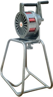 手摇警报器,是一种无需电源支持的手摇式发声器,它包含手柄、齿轮增速机构、离合滑块、定轮、鸣轮、音窗罩、齿轮箱体、箱体机架,手柄与齿轮增速机构主动轴相连接,齿轮增速机构输出轴通过销与离合滑块相连接,离合滑块与叶轮的法兰摩擦传动连接。其目的就是无需电源支持,通过摇动手柄提供动力让让警报发出警报信号,声音大小取决于手摇速度。从样式、用途上分为固定式手摇警报器、便携式手摇警报器。从声音有效距离上分直径500米和1000米。在音窗口设置档板快门机制,可进行声音强弱信号选择、迅速关闭音窗口,阻断声音,产生不同信号,具有操作方便、省力,存放、携带便捷,结构紧凑,体积小,重量轻等优点。广泛用于工厂、学校、部队、防洪专用、自然灾害、露天军营、防空、山间营救和海边防哨、森林防火、防洪防汛、消防、监狱、水库、船上、矿山、平原、牧场、加油站、机场、林场、宾馆、酒店等突发事件场所。能有效的提供事中及时预警,减少人民财产损失和人员伤亡。特别备注:手摇警报器100系列因设有档板快门机制,可随时进行声音调节,所以使用时左手拿手柄,食指一定要扣住音窗口拉钩,可让声音大小自由选择!手摇警报器120系列左手握固定柄可上下自由更换,改变声音大小!质量保证:终身包修,一年包换(人为损坏除外)!