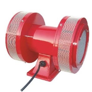 小型工业警报器是一种全方位发出高强度的与高频率的警报信号的报警器,它由小型永磁直流电机或窜激电机以每分钟5000-10000转的旋转速度带动鸣轮转动,空气从侧面或上面的进风口进入鸣轮,空气以脉冲形式从定轮、鸣轮出口处穿过,之所以产生脉冲因为定论和鸣轮结合口交替性的开合,空气流通震动产生声音,产品的频率取决于电机瞬间移动的速度和定轮结合处的通风口数量。