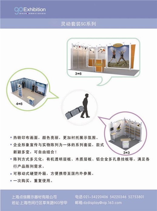 材料轻巧时尚,搭配宽幅度布艺画面,组合元素可多变,并可任意搭配,为您展现专业,与众不同的公司形象!1. 企业形象展示及实物陈列于一体的系列展位;2. 安装方便,两个人1至2小时便可轻松完成整个特装展位的装搭;3. 陈列方式多元化:有机透明层板、木质层板、铝合金多孔悬挂板,满足各行业产品陈列需求;4. 热转印布艺画面,大幅画,无接缝,颜色亮丽,更加衬托展示氛围;5. 可移动式硬塑外箱,方便携带至国内外参展;6. 一次购买,重复使用。