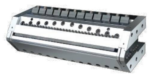 模内复合模头,通过多流道模内复合,可有效提高各层面的薄厚精度。上模唇可微调、下模唇固定及芯层45°阻流棒调节装置,适用生产PC、PS、PP、PE、PLA等多层共挤片材。