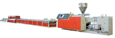 性能和优点: 参照国外最新技术,对机组进行优化设计,具有塑化均匀,剪切速率小,产量高,使用寿命长等优点。该机组有锥形双螺杆挤出机、真空定型台、牵引机、切割机、贴膜机、翻料架等组成。