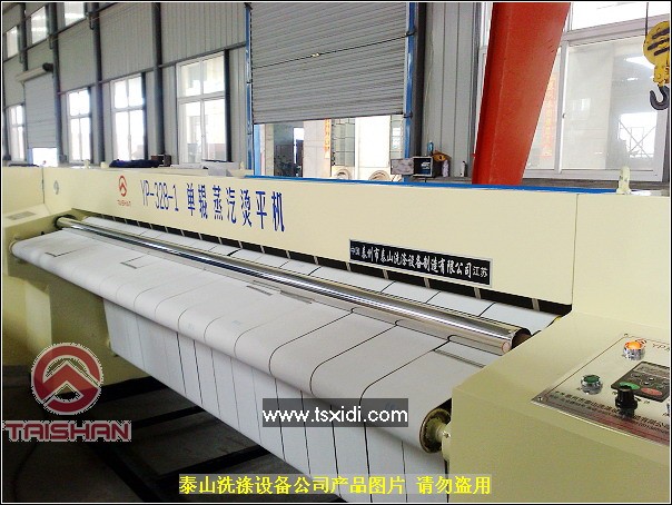 烫平机:按所熨织物的宽度分为:1800型、2500型、2800型、3000型。分单滚和双滚两种,该机由不锈钢滚筒、底架、支架、调速变频电机、输送带、输送滚筒、传动部件、电器部件等组成。通过蒸汽或电热管将不锈钢滚筒表面加热,由输送带把布草、床单、被套等输送进加热后的不锈钢滚筒表面,经高温达到熨平的效果。
