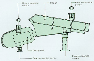 橡胶弹簧给料机是将不衡旋转所产生的强力振动源和工振用的橡胶弹簧有效的组合起来的一种振动给料机。采用了共振方式,所以用较小的驱动力即可发挥出很大的振动效果。另外,在运转中能够方便地调整给料量,并能瞬时停机,所以可作为称量用给料机使用。其结构由运送物料的料槽、产生振动的驱动部以及将它们结合在一起的共振用的橡胶弹簧组成。驱动部的不平衡块旋转所产生的椭圆振动会对料槽上的物料产生和直线振动一样的效果。因此,能够快速地运出、给给大量的砂和砂土等物料。