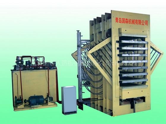 该压机主要用于热压制作刨花板、中密度纤维板等产品。规格有1200吨,7-12层,热板1400*2600mm。