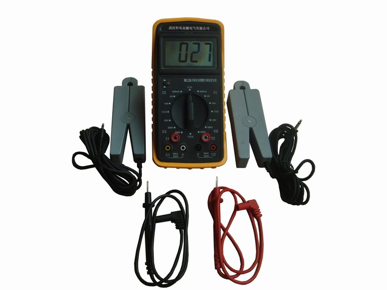 ML12A型手持式双钳数字相位伏安表是专为现场测量电压、电流及相位而设计的一种低价位、便携手持式、双通道输入测量仪器。用该表可以很方便地在现场测量U-U、I-I及U-I之间的相位,判别感性、容性电路及三相电压的相序,检测变压器的接线组别,测试二次回路和母差保护系统,读出差动保护各组CT之间的相位关 系,检查电度表的接线正确与否等。采用钳形电流互感器转换方式输入被测电流,因而测量时无需断开被测线路。测量U1-U2之间相位时,两输入回路完全绝缘隔离,因此完全避免了可能出现的误接线造成的被测线路短路、以致烧毁测量仪表。显示器采用了高反差液晶显示屏,字高达25mm,屏幕角度可自由转换约70°,以获得最佳视觉效果。本表的欠电指示功能可及时提醒操作者更换电池。