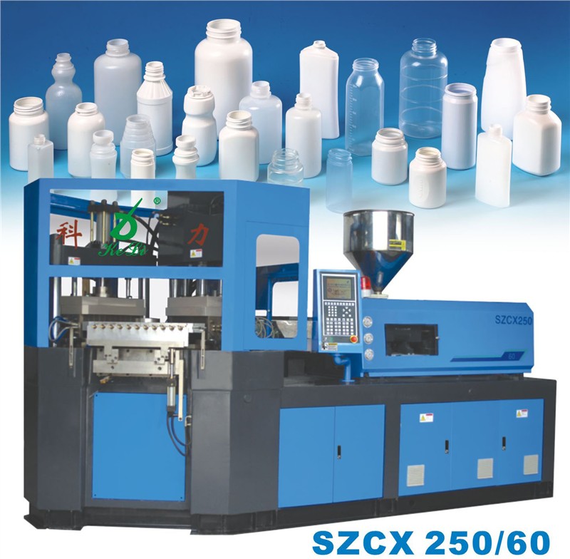 科力SZCX一步三工位注吹中空成型机,一步法全自动塑料吹瓶机,用于PP,PE,PS,ABS,BAREX,PC,单层塑料瓶生产,主要应用于医药,食品,化妆品包装行业。