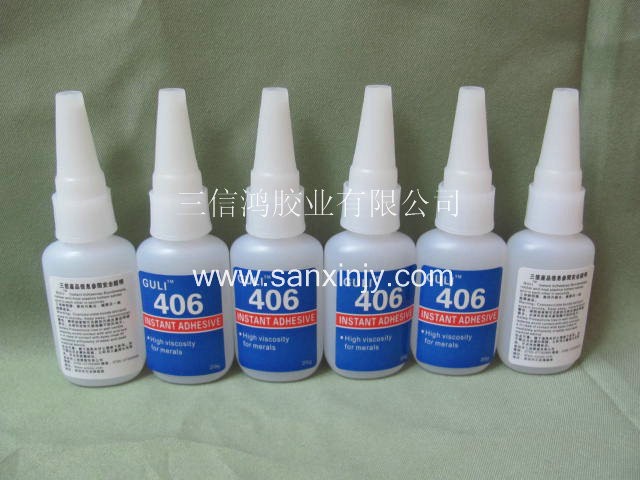 深圳市三信胶业有限公司生产销售的400快干胶系列。低白化,高强度。通用及常用型其对于金属、塑胶、橡胶以及惰性材料与常规材料粘接。
